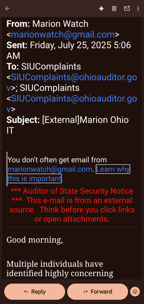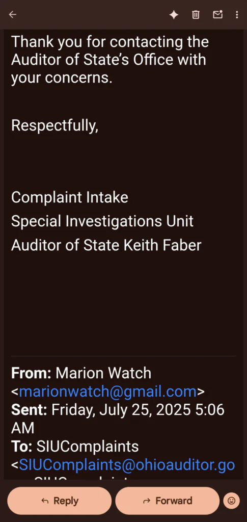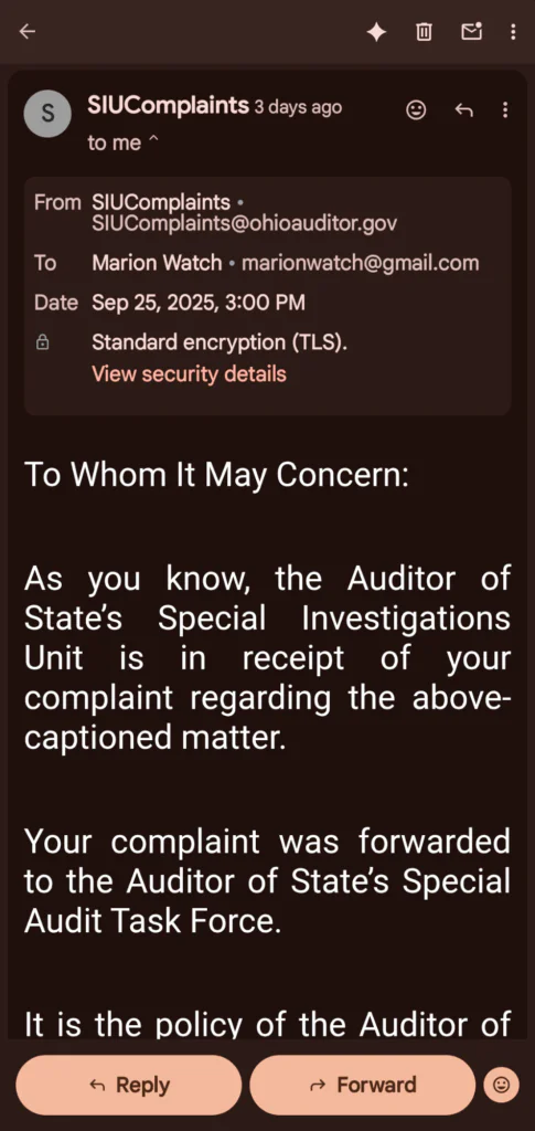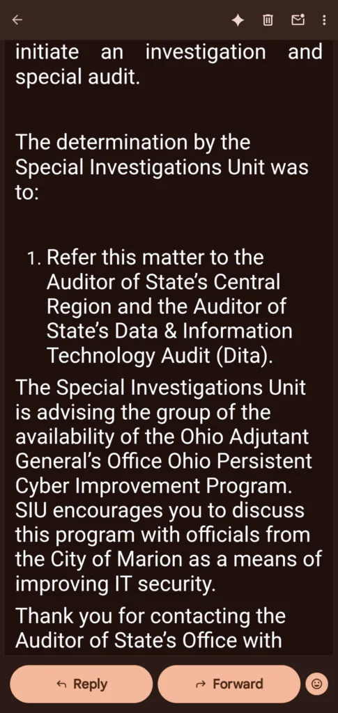 We’ve received an important email from the Ohio Auditor of State’s Special Investigations Unit (SIU) about the serious financial and computer system problems in the City of Marion. Our initial complaint to them, which you can see parts of in the attached emails, talked about issues that have been happening for a very long time—at least since 1983, based on the oldest official audit we have.