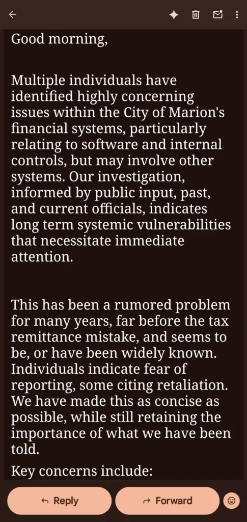 Marion Watch will be responding to this communication with more specific information and will continue to update the public in the interest of transparency, accountability, and truth.