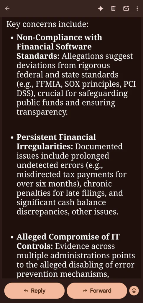 - Financial Mess: We reported problems like significant errors in tax payments for over six months, a lot of penalties for filing things late, and big differences in how much cash the city reported having. This suggested that money was not being tracked correctly.