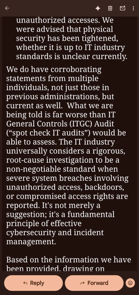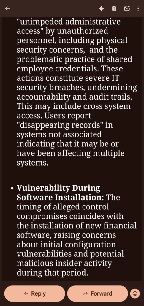 - Long-Term Problem: We pointed out that these problems are not new. They are systemic vulnerabilities that have built up over time and need immediate, specialized attention, specifically, a deep forensic IT investigation to find the root cause.