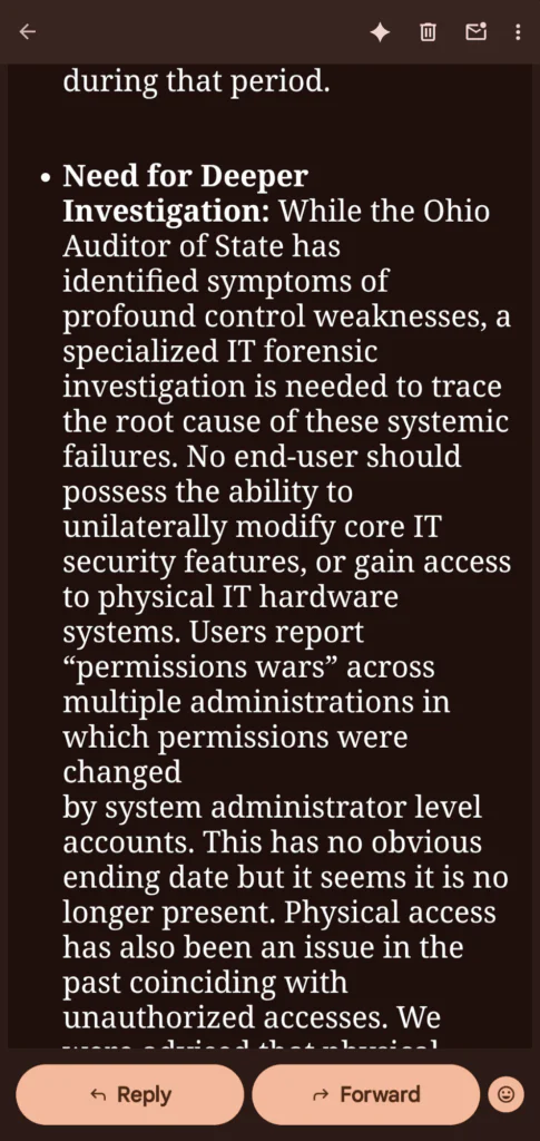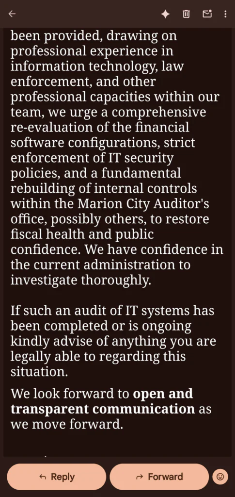 These decades long failures, documented by official Ohio Auditor of State Audits dating back to at least 1983, have enabled the Silent Sabotage of Marion’s financial systems and information technology systems. Our email to the Ohio Auditor of State was signed by all Marion Watch Core Team, and our opinion was validated by several IT experts, and those in the legal and financial sectors in Ohio and beyond.