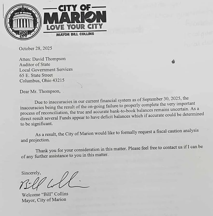 Mayor of the City of Marion Welcome “Bill” Collins made the following address to Marion City Council at its regular meeting held on October 27th in order to announce the city’s request to the Auditor of the State of Ohio for a fiscal caution analysis and projection: