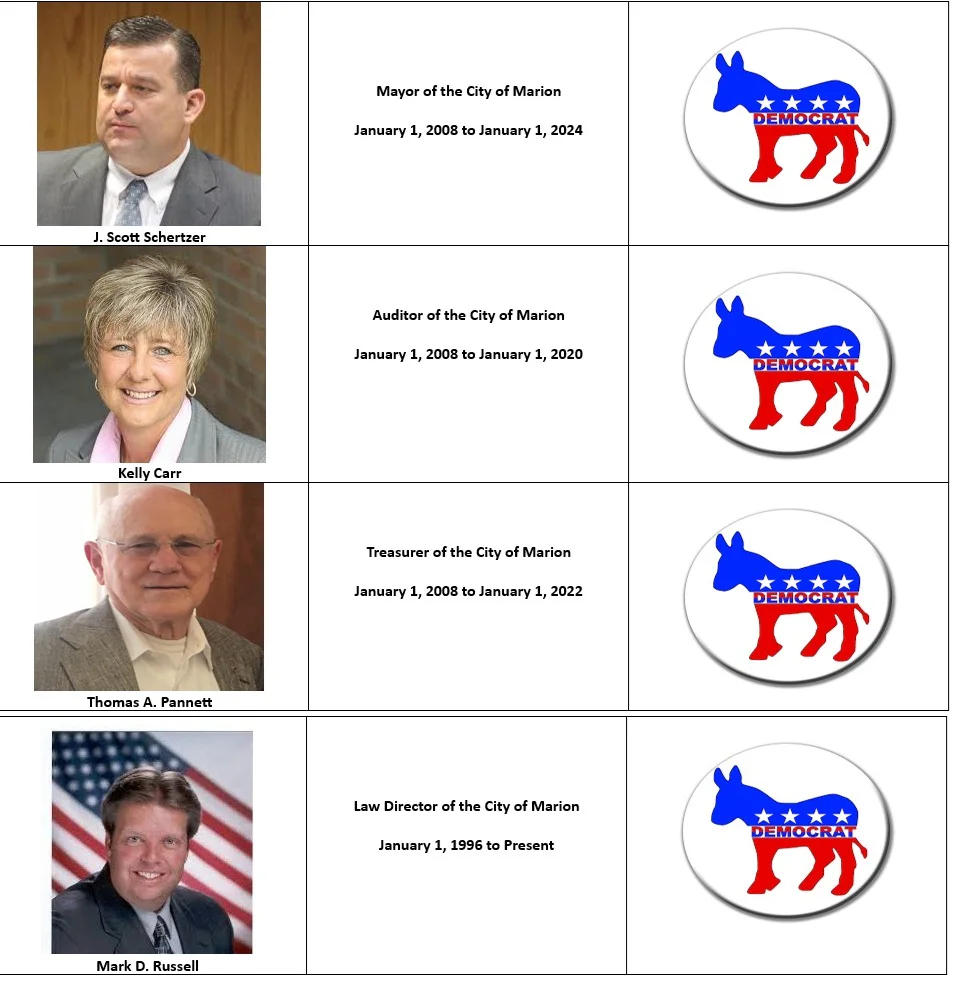 The following January, the city of Marion was controlled by a Democratic mayor (J. Scott Schertzer), a Democratic auditor (Kelly Carr), a Democratic treasurer (Thomas A Pannett), and a Democratic law director (Mark D Russell). The Democratic Party also held a supermajority in Marion City Council, with seven of the nine seats held by Democrats (Amy Pinnick- At Large, Mary Crowe-At Large, Ralph Cumston-1W, Ayers Ratliff-2W, Mike Thomas-3W, Debbie Blevins-4W, and John Smith-5W). Republicans, meanwhile, were essentially powerless, holding only two seats on Marion City Council (Jason Schaber-At Large and Dr. James Gilsdorf-6W).