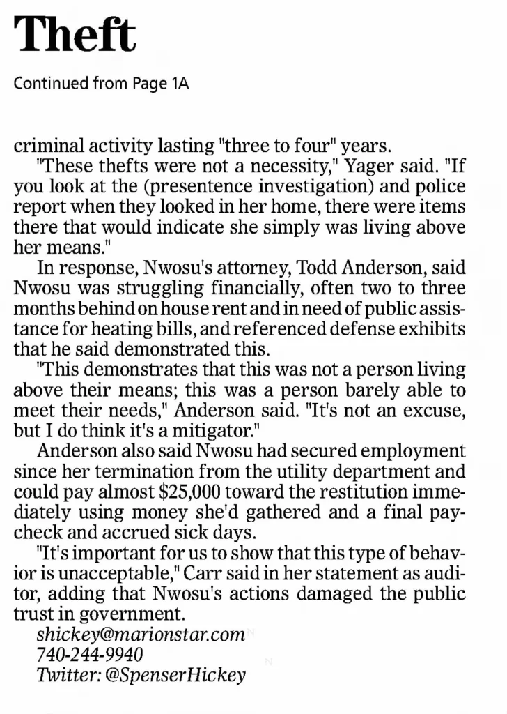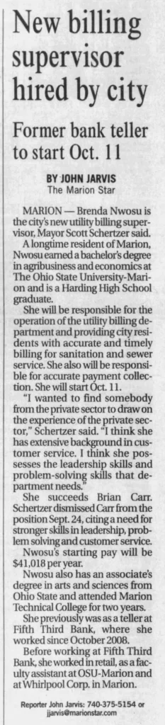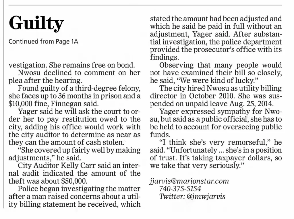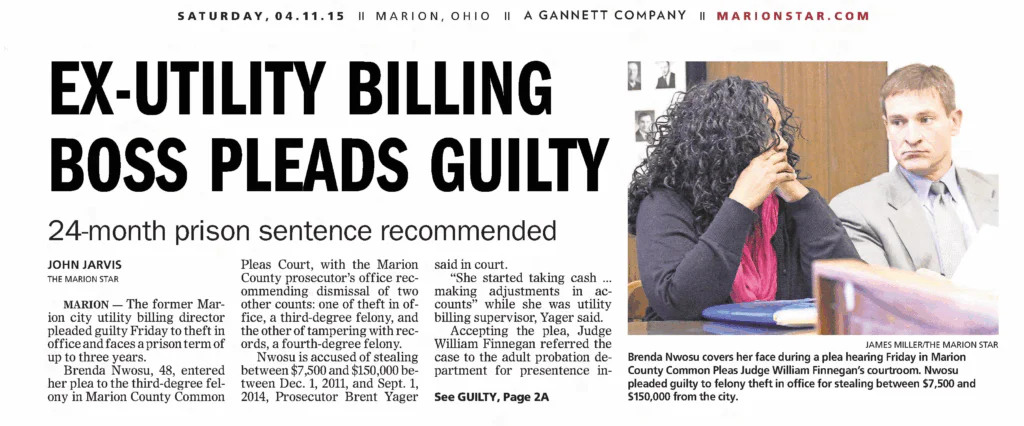 Within two weeks of the termination of Mr. Carr, the Schertzer administration appointed Brenda Nwosu, who was previously employed as a bank teller at Fifth Third bank, to the position of supervisor of Utility Billing. Nwosu would serve in that position until she was fired for stealing over $34,000 from the city and subsequently pleaded guilty to the theft charges in 2015.