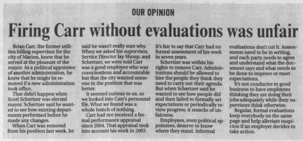 Mayor J. Scott Schertzer, when asked about Mr. Carr’s termination, said “My feeling as the chief executive of the city of Marion is that he wasn’t fully embracing the new software that was put in place.”