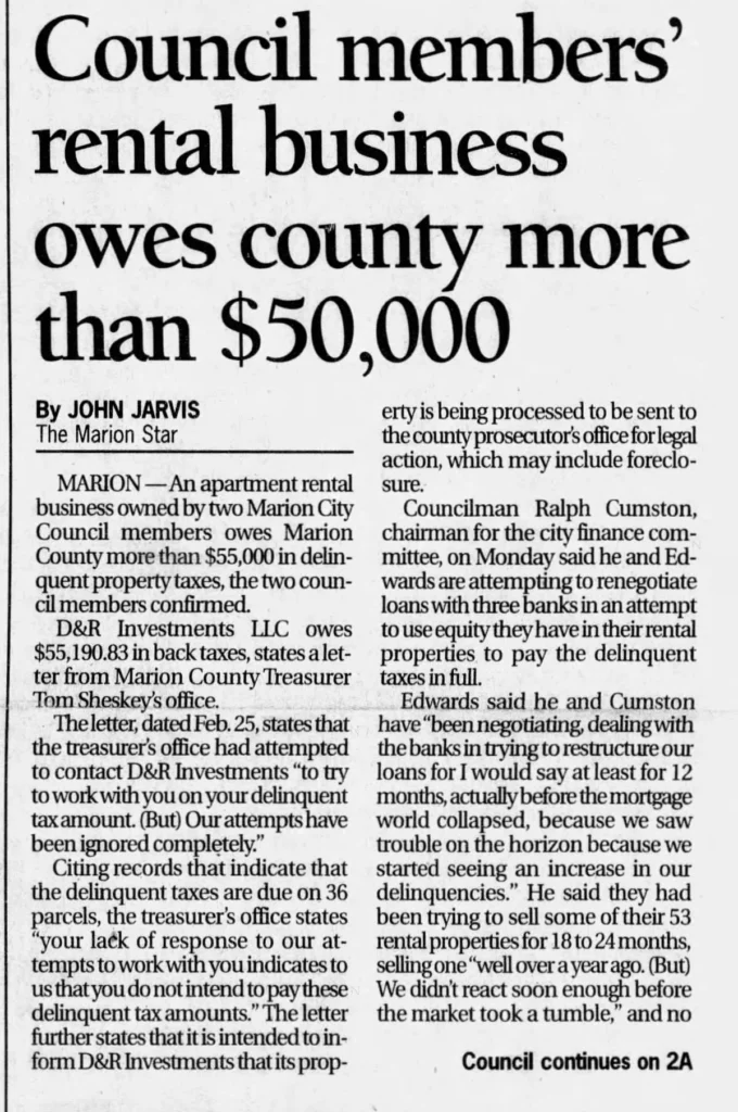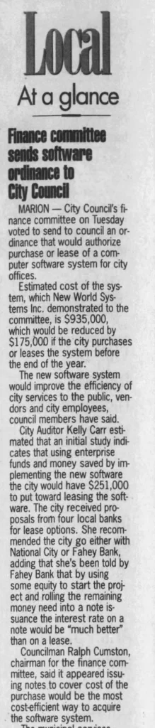 Well, in the fall of 2008, the Democratic-controlled Marion City Council, after recommendation by Council’s Finance Committee, which was chaired by Ralph Cumston (D-1W), who found himself embroiled in a nearly $60,000 delinquent tax scandal the following year, approved the purchase of a new accounting software system, called New World, which came with an initial price tag of $935,000.