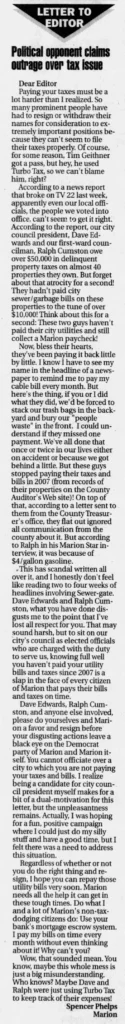 Coincidentally, a little more than a year later, in September 2010, Mayor J. Scott Schertzer and his Service Director, Jay Shoup, inexplicably and without cause, terminated the employment of the city’s long-time supervisor of Utility Billing, Brian Carr (no apparent relation to the then-auditor Kelly Carr), who was appointed to the position in 1995 during the Republican administration of Mayor Jack Kellogg.