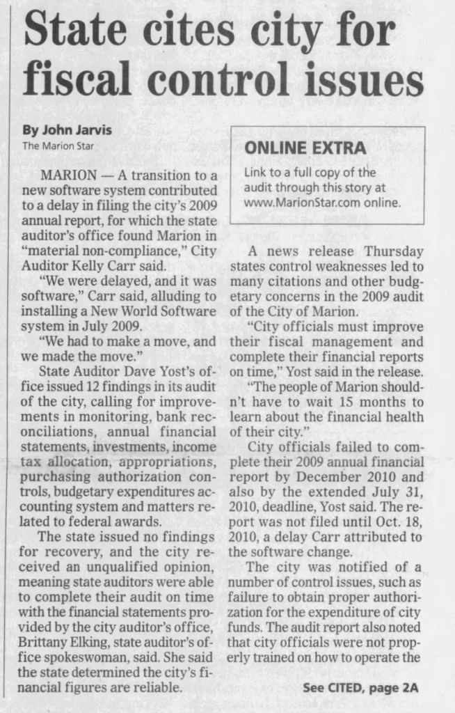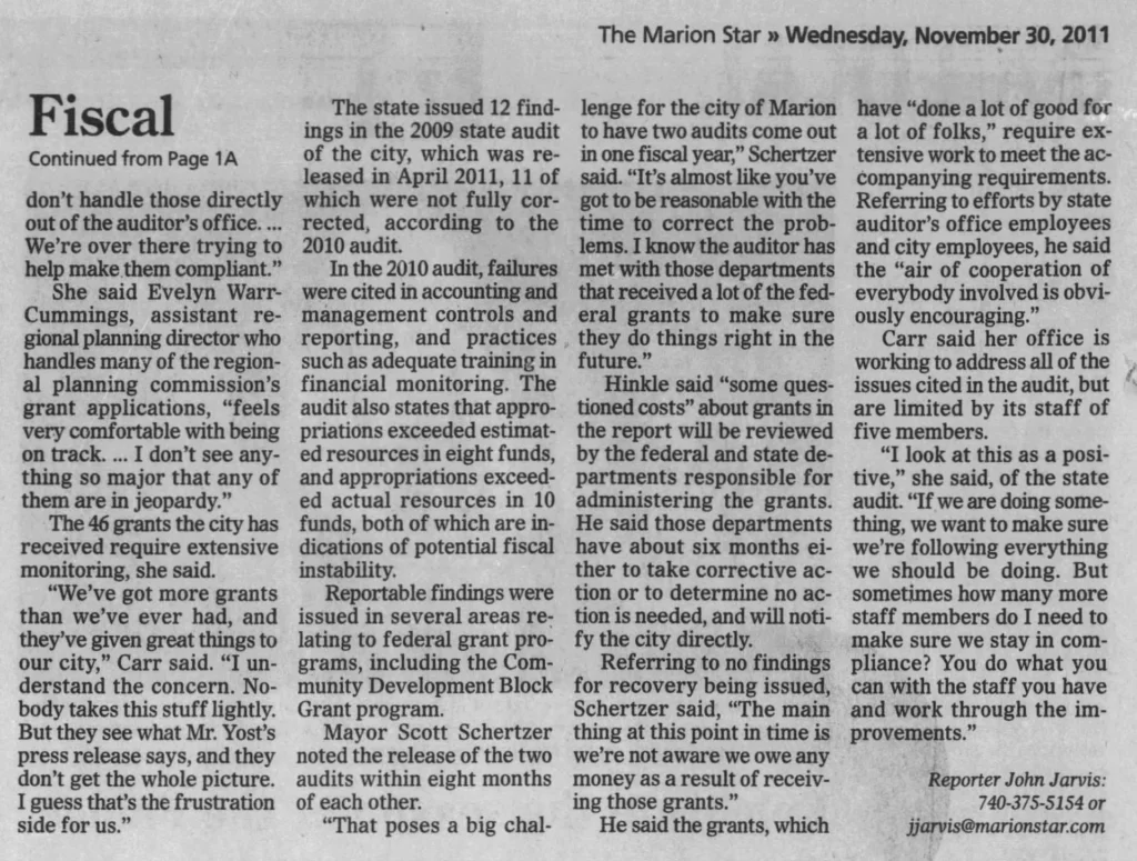 In April 2011, the Auditor of the State of Ohio’s office issued twelve findings in its 2009 audit of the city, which included needed improvements in monitoring, bank reconciliations, annual financial statements, investments, income tax allocation, appropriations, purchasing authorization controls, budgetary expenditures, overall accounting system, and matters related to federal awards. The State Auditor noted that “control weaknesses led to many citations and other budgetary concerns in the 2009 audit of the city of Marion. City officials must improve their fiscal management and complete their financial reports on time. The people of Marion shouldn’t have to wait 15 months to learn about the financial health of their city.”