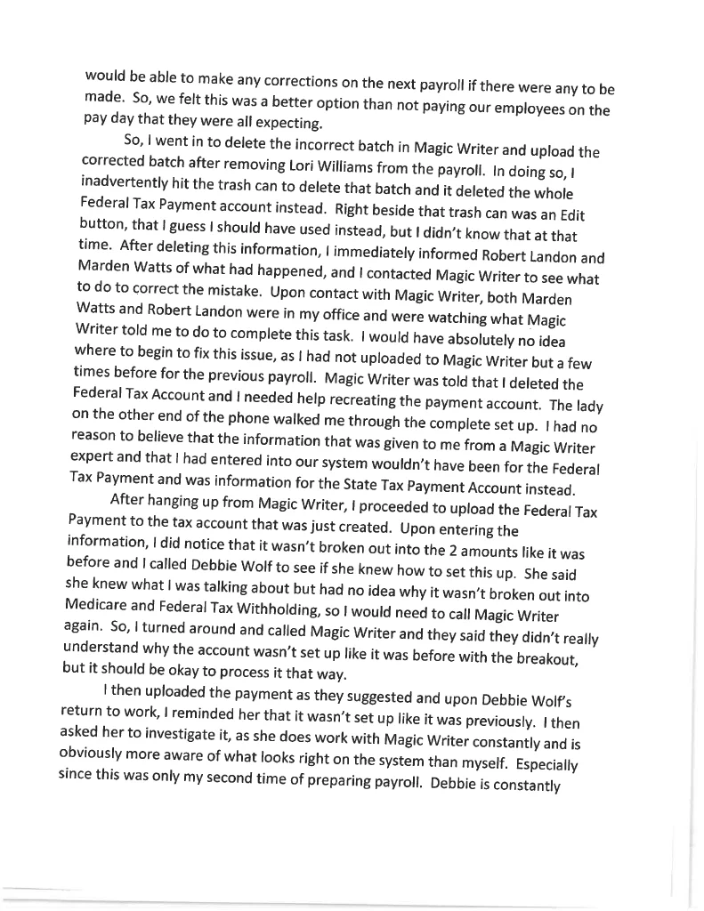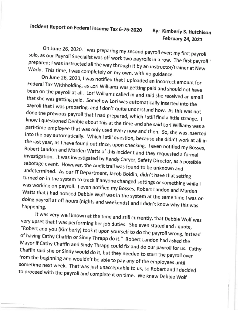 Employee Kim Hutchinson Incident Report Detailing the ACH System Issues