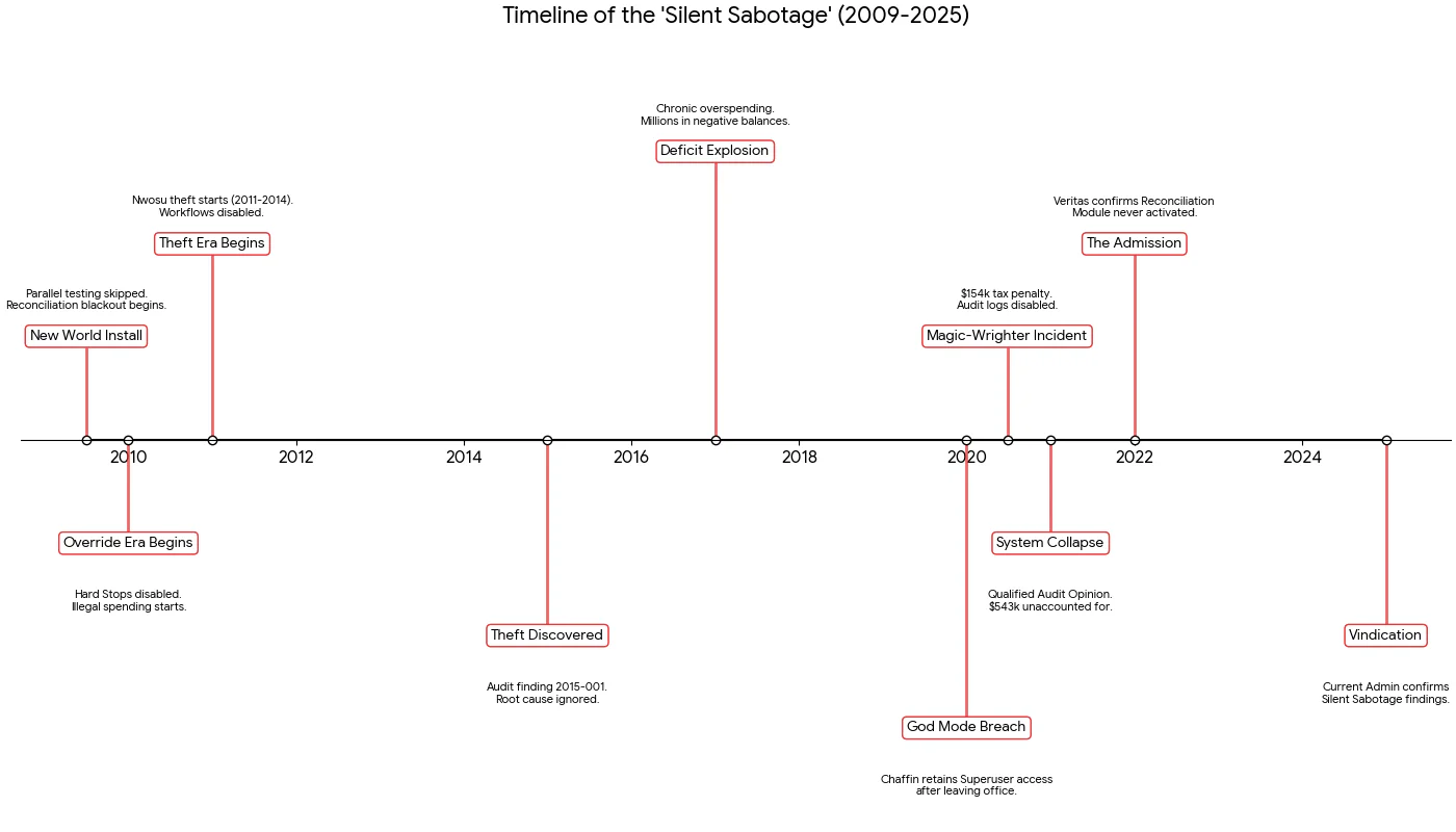 - Suspicion (2015): We suspected that the “hard” modules—specifically Automated Reconciliation and Budget Controls—were bypassed or never installed to meet an artificial deadline or to avoid the friction of proper accounting.