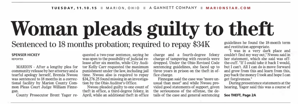 - 2015 Audit (Finding 2015-001): Utility Supervisor Brenda Nwosu stole $34,276 over 3.5 years (2011–2014). She did this by taking cash payments and then manually “adjusting” the customer’s bill to zero to hide the theft.