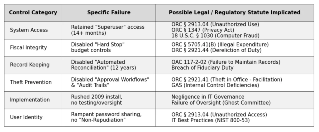 - ORC § 2921.44 (Dereliction of Duty): By disabling the very mechanism designed to ensure compliance with 5705.41(B), the administration recklessly failed to perform a duty expressly imposed by law—preventing illegal expenditures.