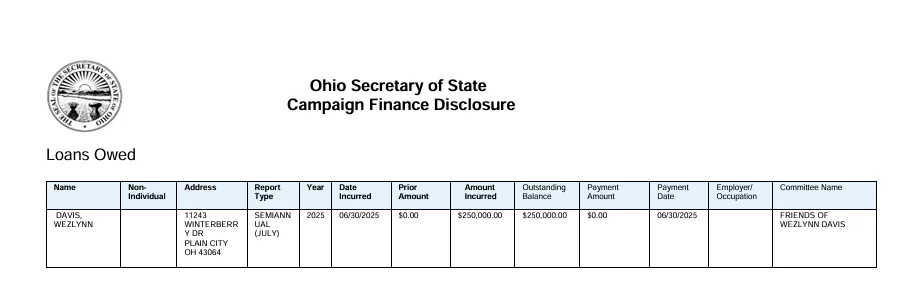 Official records from the Ohio Secretary of State’s website confirm Davis’s statement. A filing for the “Friends of Wezlynn Davis” committee shows a $250,000 “Loan” entry for Wezlynn Davis, dated June 30, 2025. Despite the noise generated by Spears’s podcast, these state records indicate that the campaign’s financial disclosures are current, with the next public disclosure expected in late January 2026.