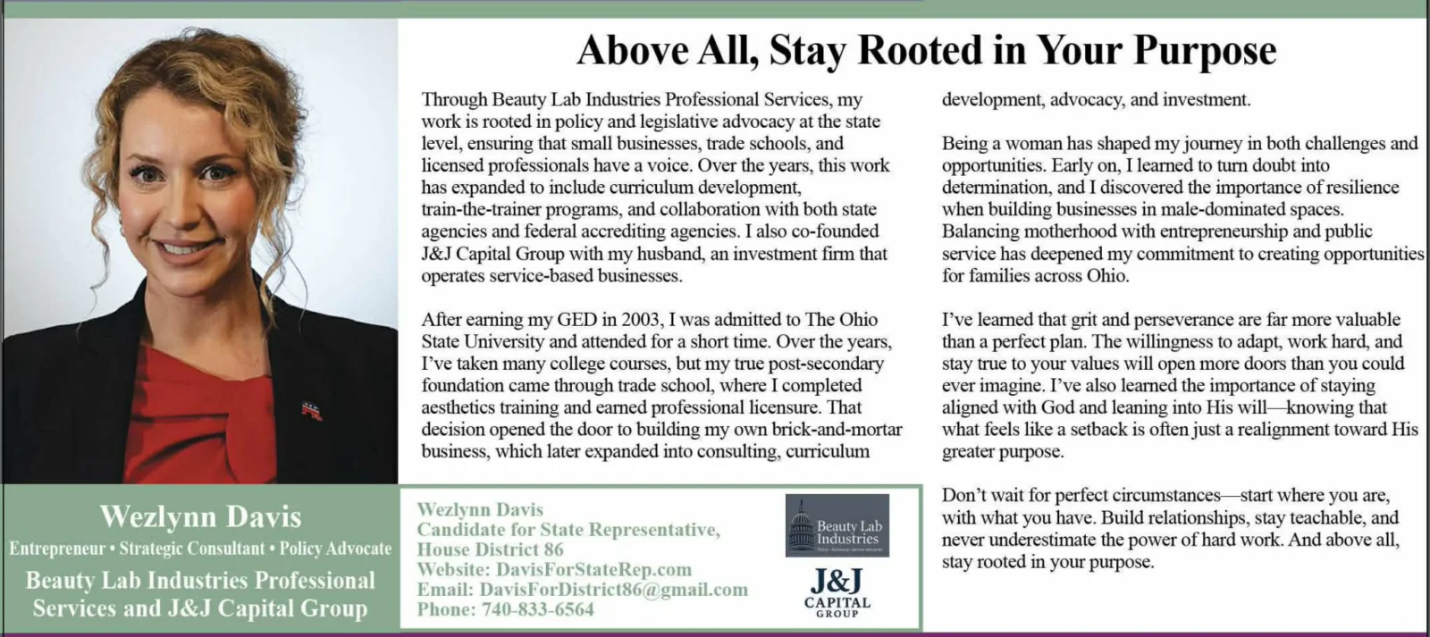 Website: DavisForStateRep.com Email: DavisForDistrict86@gmail.com Phone: 740-833-6564