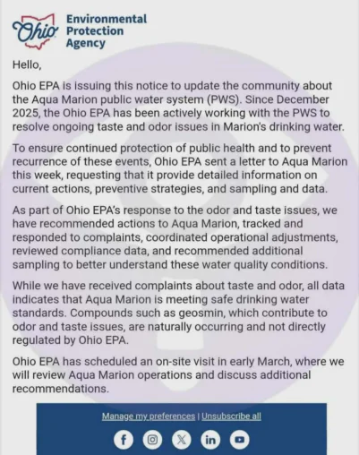 In a notice released this week, the Ohio EPA confirmed it has sent a formal letter to Aqua Marion requesting detailed information on their current actions, preventive strategies, and specific sampling data. While the utility has maintained that the water is safe, the EPA is now requiring a closer look at the data behind those claims.