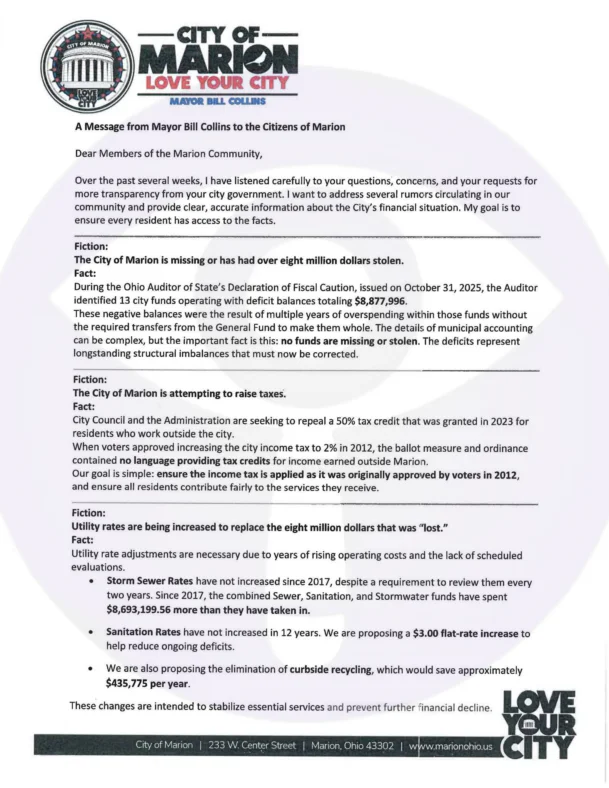 Following our recent coverage of proposed budget cuts at Marionwatch.com, Mayor Bill Collins has issued a formal address to the community. In a “Fiction vs. Fact” breakdown, the Mayor is attempting to clear the air regarding the city’s $8.8 million deficit and the state-mandated recovery plan currently in motion.