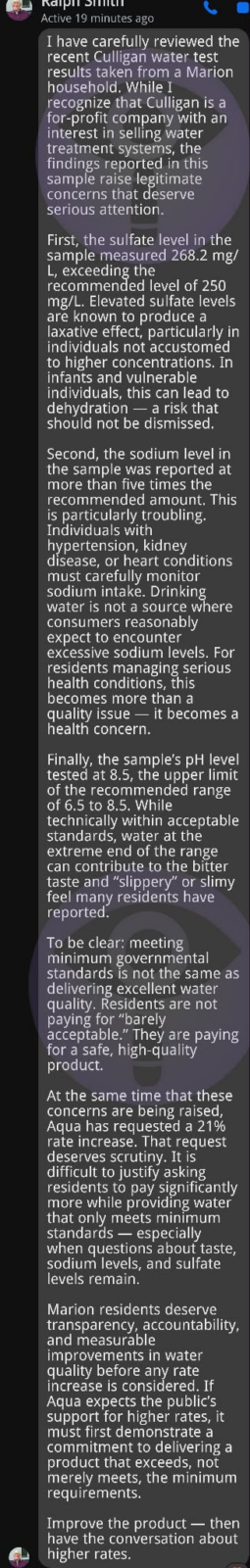 Echoing these concerns, Ralph Smith cautioned that while Culligan is a for‑profit entity, the findings “raise legitimate concerns that deserve serious attention.” Smith criticized the utility’s current stance during a time of requested rate hikes: “To be clear: meeting minimum governmental standards is not the same as delivering excellent water quality. Residents are not paying for ‘barely acceptable.’ They are paying for a safe, high-quality product.” He urged the community to “improve the product—then have the conversation about higher rates.”
