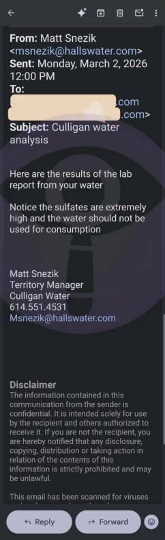 The situation reached a breaking point on March 2, 2026, when Culligan Territory Manager Matt Snezik issued a blunt warning to a resident, Marion City Councilwoman Pam Larkin, after reviewing their lab results: “Notice the sulfates are extremely high and the water should not be used for consumption.” This professional alarm stands in direct opposition to Aqua Ohio’s repeated public claims that the water “continues to meet all state and federal standards.”